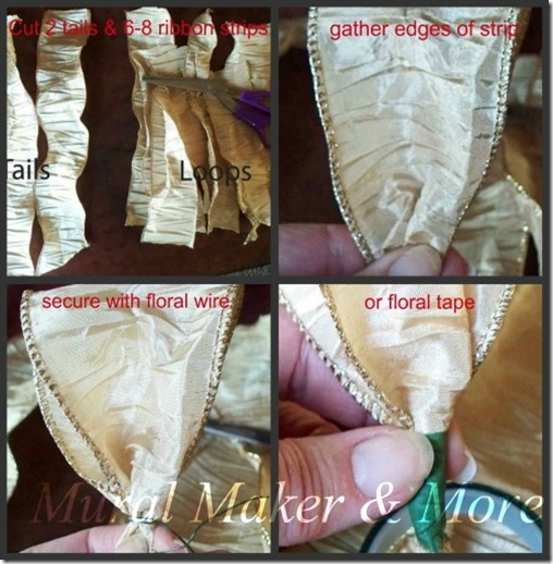 You just cut some strips of ribbon about 7-9” in length, and two or three tails, gather each one, and wrap it with wire or floral tape. If you use wire, I recommend 22 or 24 gauge wire.